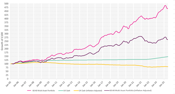 To demonstrate this, you might want to consider the following illustration, which shows the performance of a 60:40 multi-asset investment portfolio between 1 January 2005 and 1 July 2025.