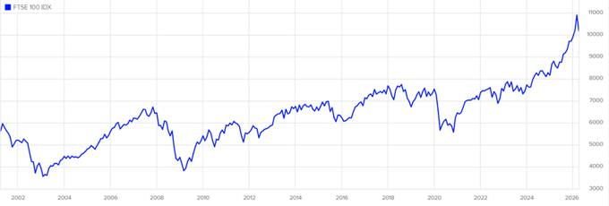 Historically, however, the stock market has tended to rise over the long term, something illustrated by the following graph, showing the performance of the FTSE 100 between March 2001 and March 2026. The index tracks the performance of the largest 100 companies listed on the London Stock Exchange.