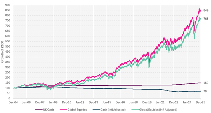 To illustrate this, you might want to consider the following graph, which shows the performance of global equities and a medium risk 60:40 multi-asset portfolio between 1 January 2005 and 31 December 2025.
